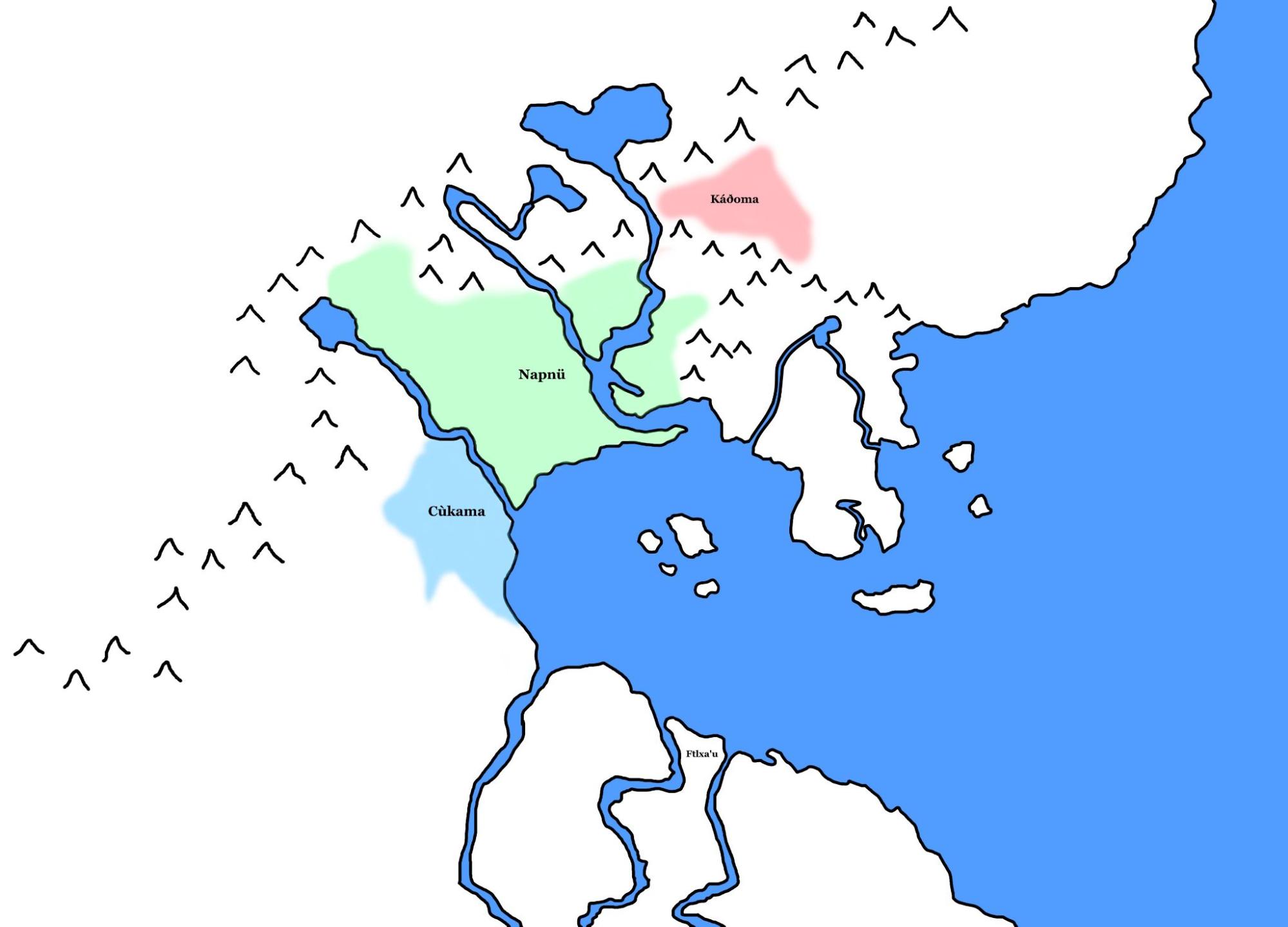 Despite their proximity to one another, the languages have developed in very different directions. This is perhaps unexpected, considering how close they are to one another geographically. Because of this, other factors need to be sought out to explain how the languages diverged so much. The most obvious is the provincial divisions established during Liqak rule, which separated the Napnü peninsula into its own administrative region, while using the region where Káðoma is spoken as a military outpost. Cùkama likely arrived at its location when various Tsuman tribes fled the Liqak conquest to establish themselves in safer areas. They likely intermingled with pre-Tsuman cultures, which might explain Cùkama’s aberrant phonology and grammar.