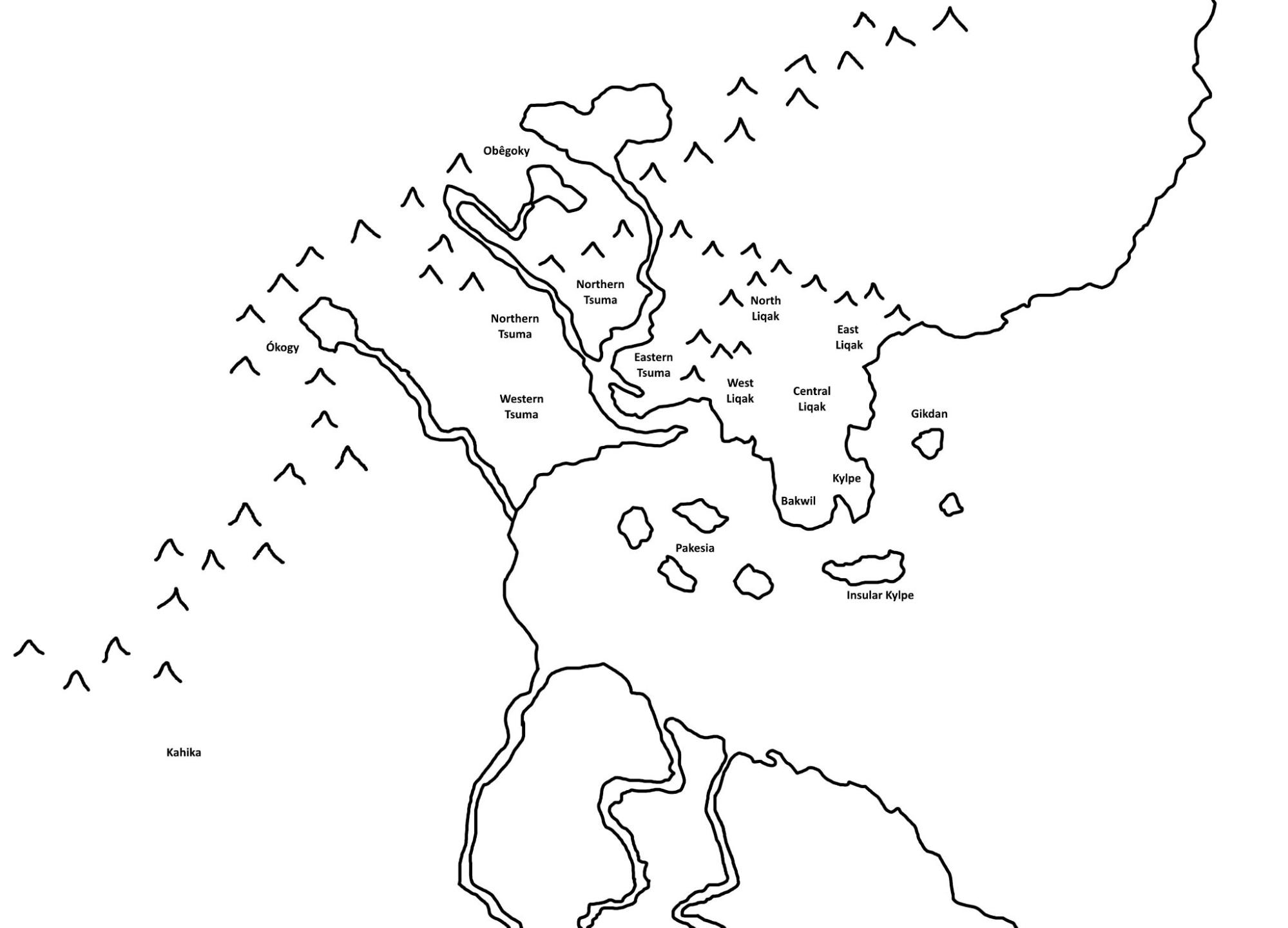 The Tsuma peoples do not have any names for themselves. They see themselves as simply ‘the people’ or ‘the tribes’, and all other names for them are exonyms given to them by other cultures, these being entirely unknown by them. They are referred to as the Tsuma in this document and elsewhere, as this is my personal name for the language, but the name is not used by the speakers in the conworld. ‘Tsuma’ is simply the collective form of the noun uma ‘speech’ or ‘mouth’, and so the name actually means ‘all (of our) speech’. One way this word form would occur naturally is in the phrase tsuma nyéweho, meaning ‘the speech of all tribes’.